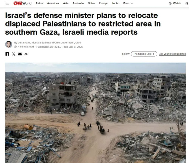 据美国有线电视新闻网8日报道,以色列国防部长卡茨于当地时间7日表示,他已要求以军制定计划,将加沙地带全部人口“集中转移”至一个新建立的“人道主义城”。在相关报道的评论区,不少读者称卡茨此举实则是在建“集中营”。